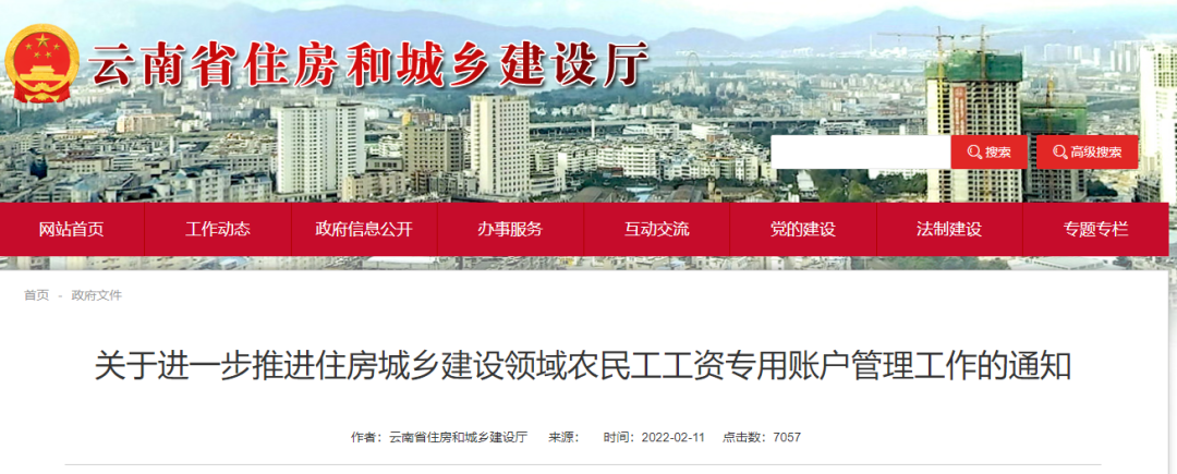2月11日,云南住建廳發布了《關于進一步推進住房城鄉建設領域農民工工資專用賬戶管理工作的通知》。