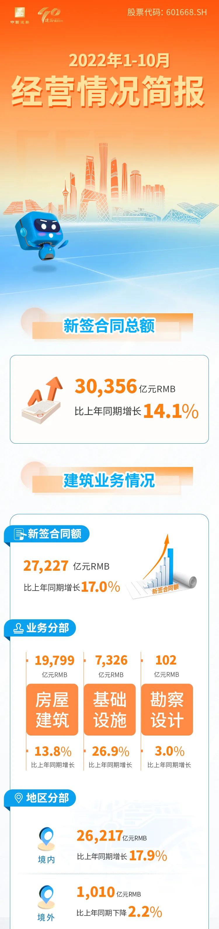 11月15日,中國建筑發布企業最新經營情況簡報,根據節選部分公告顯示,2022年1-10月,中國建筑累計新簽合同額30356億元,同比增長14.1%。其中,建筑業務新簽合同額27227億元,同比增長17.0%;地產業務合約銷售額2725億元,同比下降9.3%。