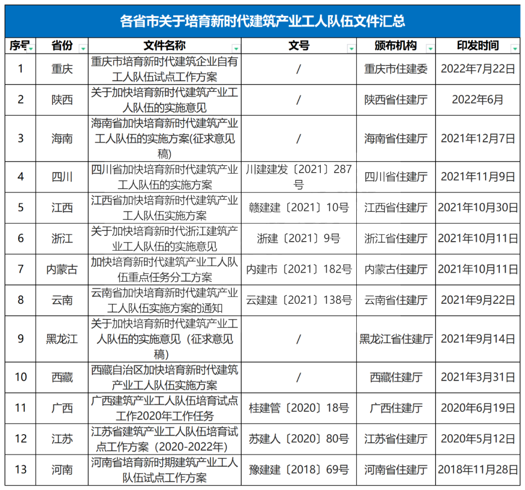 2020年12月,住房和城鄉建設部、發改委等12部門發布《關于加快培育新時代建筑產業工人隊伍的指導意見》,明確提出,加快自有建筑工人隊伍建設。