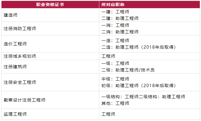 由上表,以建造師證書為例,二級建造師可直接認定為助理工程師職稱,一級建造師可直接認定為工程師職稱,并可作為申報高一級職稱的條件。