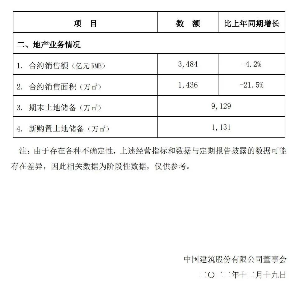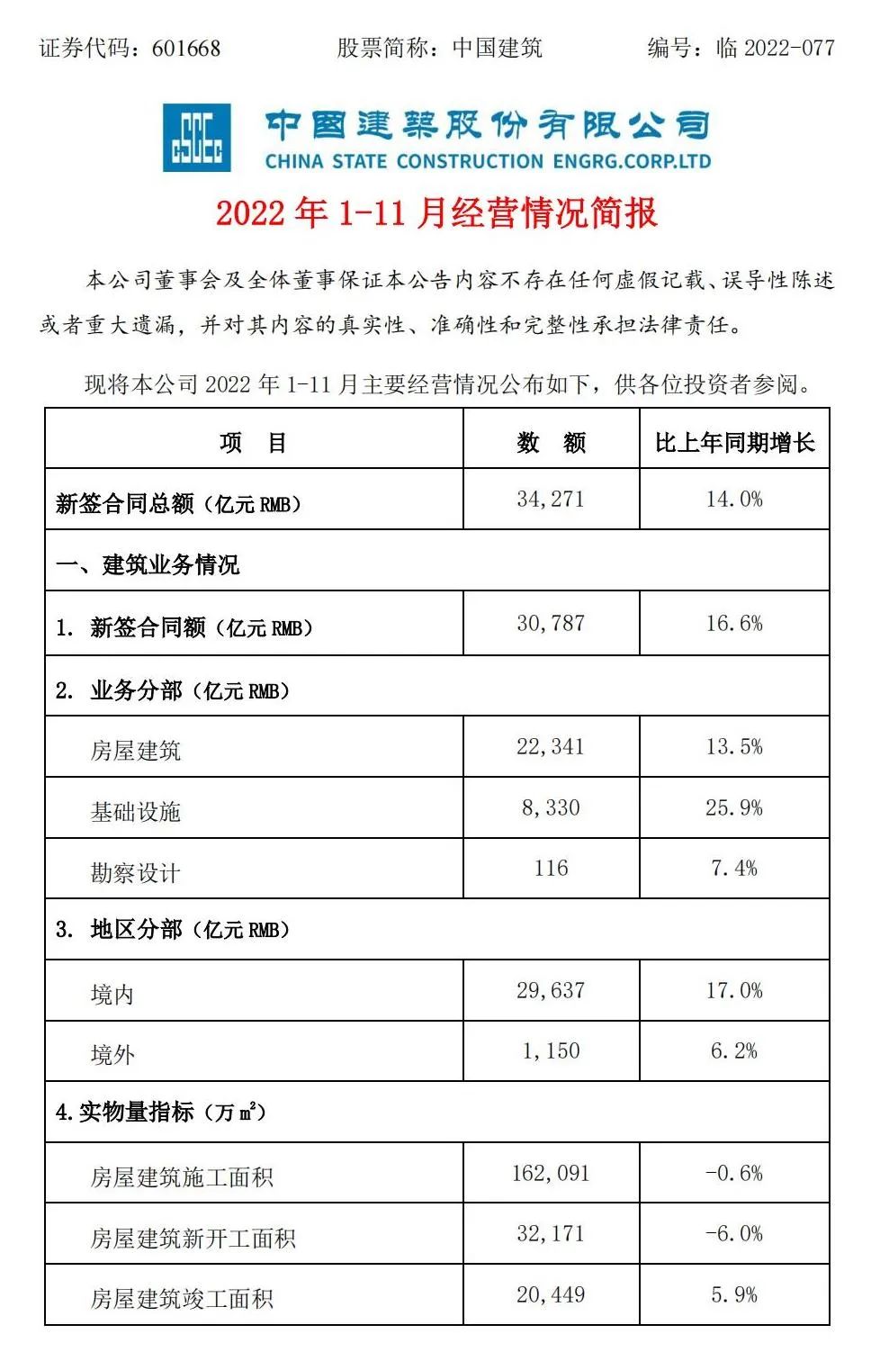 12 月 20 日,中國建筑股份有限公司(以下簡稱“中國建筑”)發布了其 2022 年 1-11 月經營情況簡報公布。
