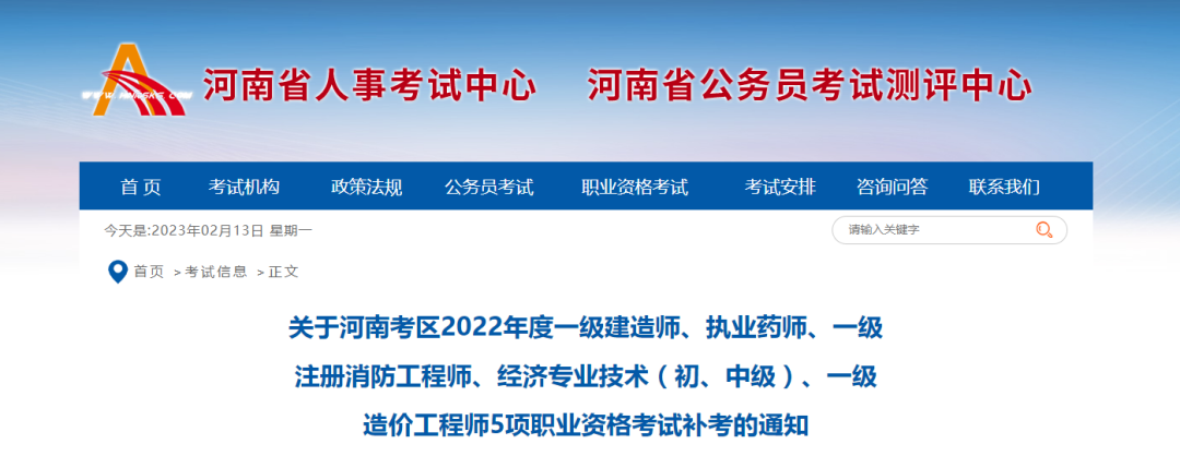 關于河南考區2022年度一級建造師、一級造價工程師職業資格考試補考的通知