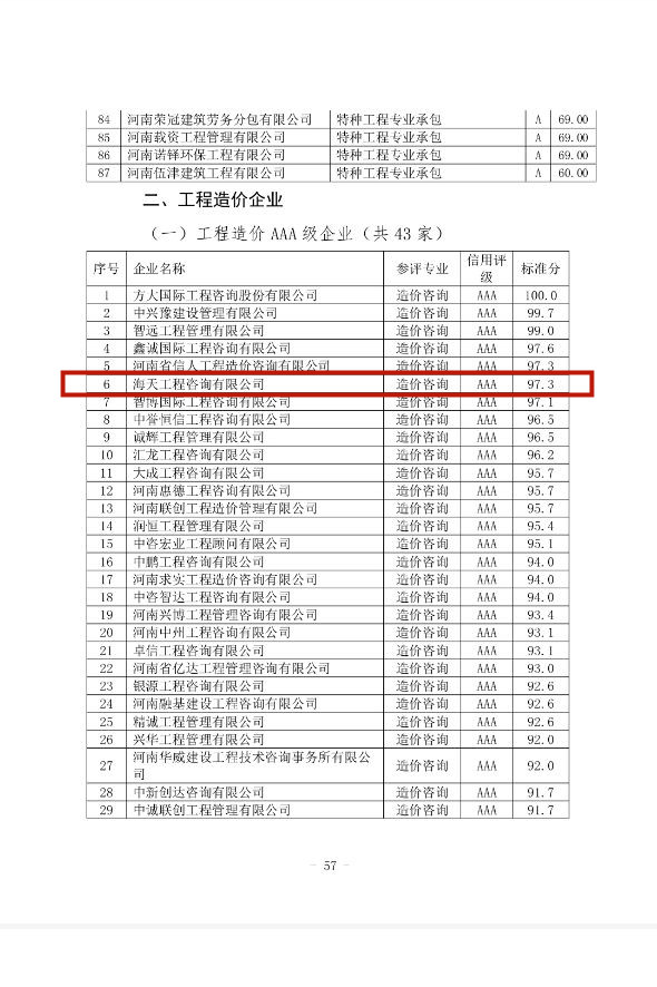 在鄭州市城鄉建設局發布關于2021年度鄭州市建筑企業信用評價審核結果中,海天咨詢榮獲工程造價3A級企業以97.3高分名列前茅。